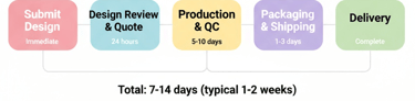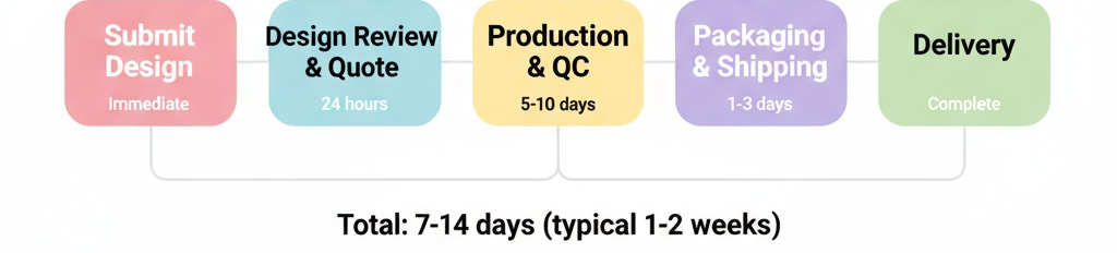 Typically 1–2 weeks from quote approval to delivery. This includes 24-hour quote response, 5–10 days production/QC, and 1–3 days shipping. Rush orders available for faster turnaround.