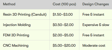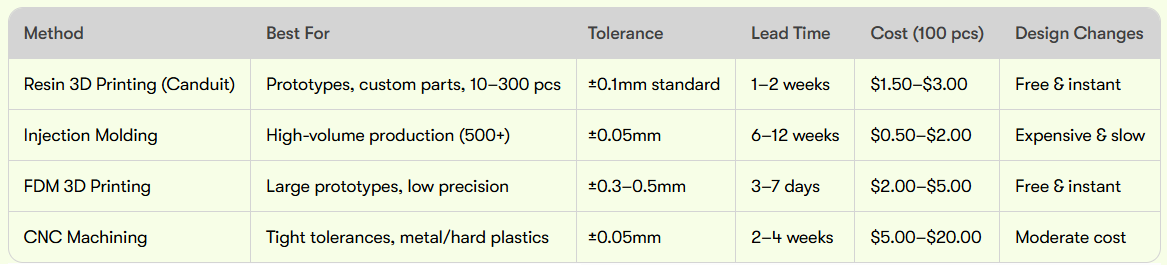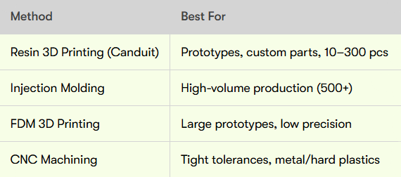 How ABS-like resin compares to injection molding, other 3D printing methods, and CNC machining for electronics applications.
